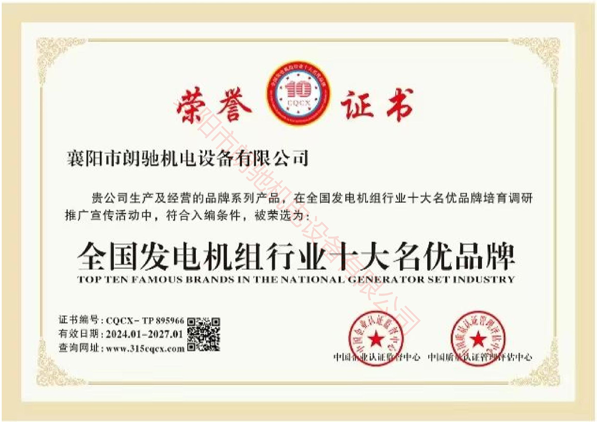 荣誉证书-全国发电机组行业十大名优品牌